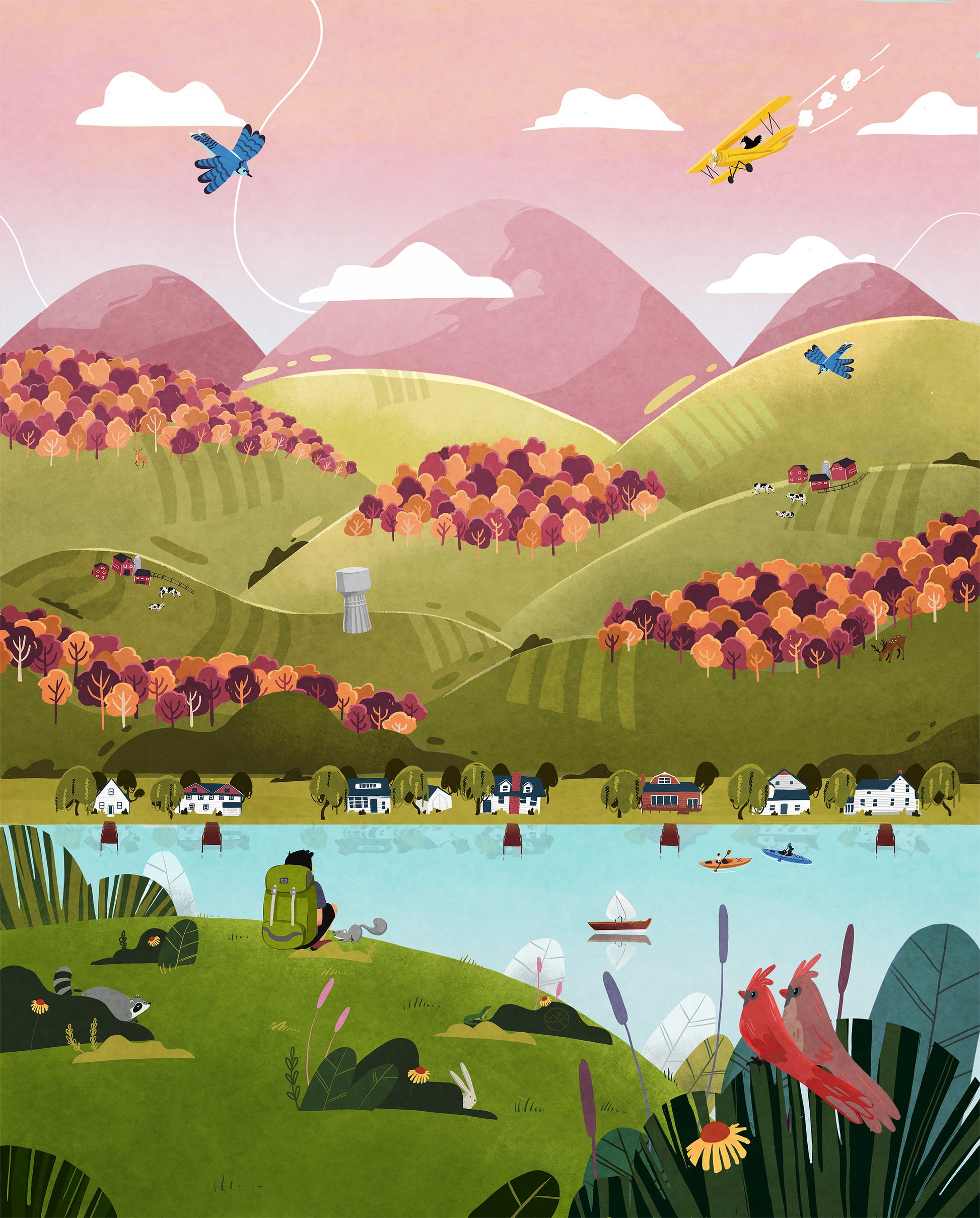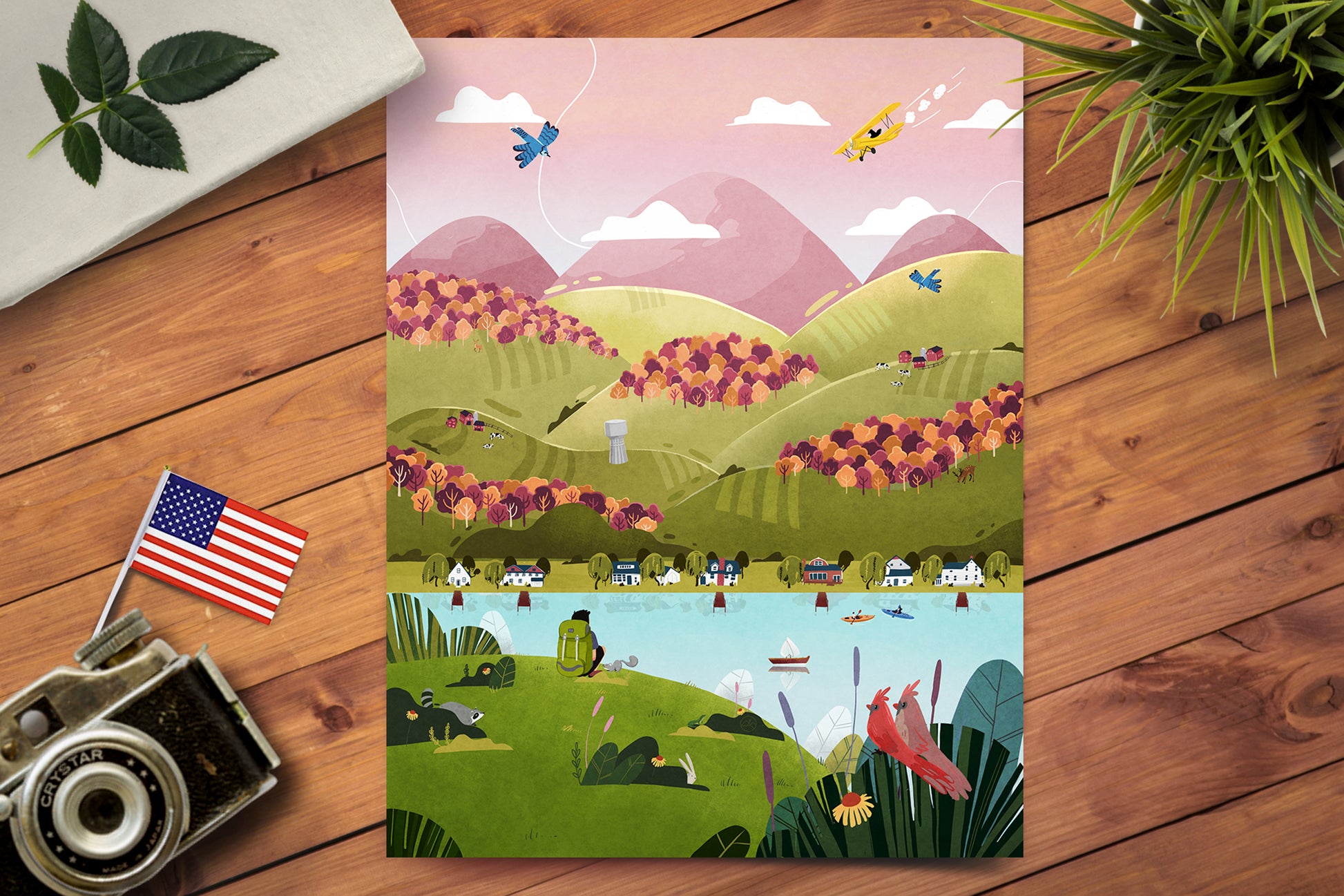 This fantasy landscape print features autumn foliage in the rolling hills of upstate New York. Available in multiple sizes, this whimsical art print comes ready for you to frame and hang in your favorite spot.