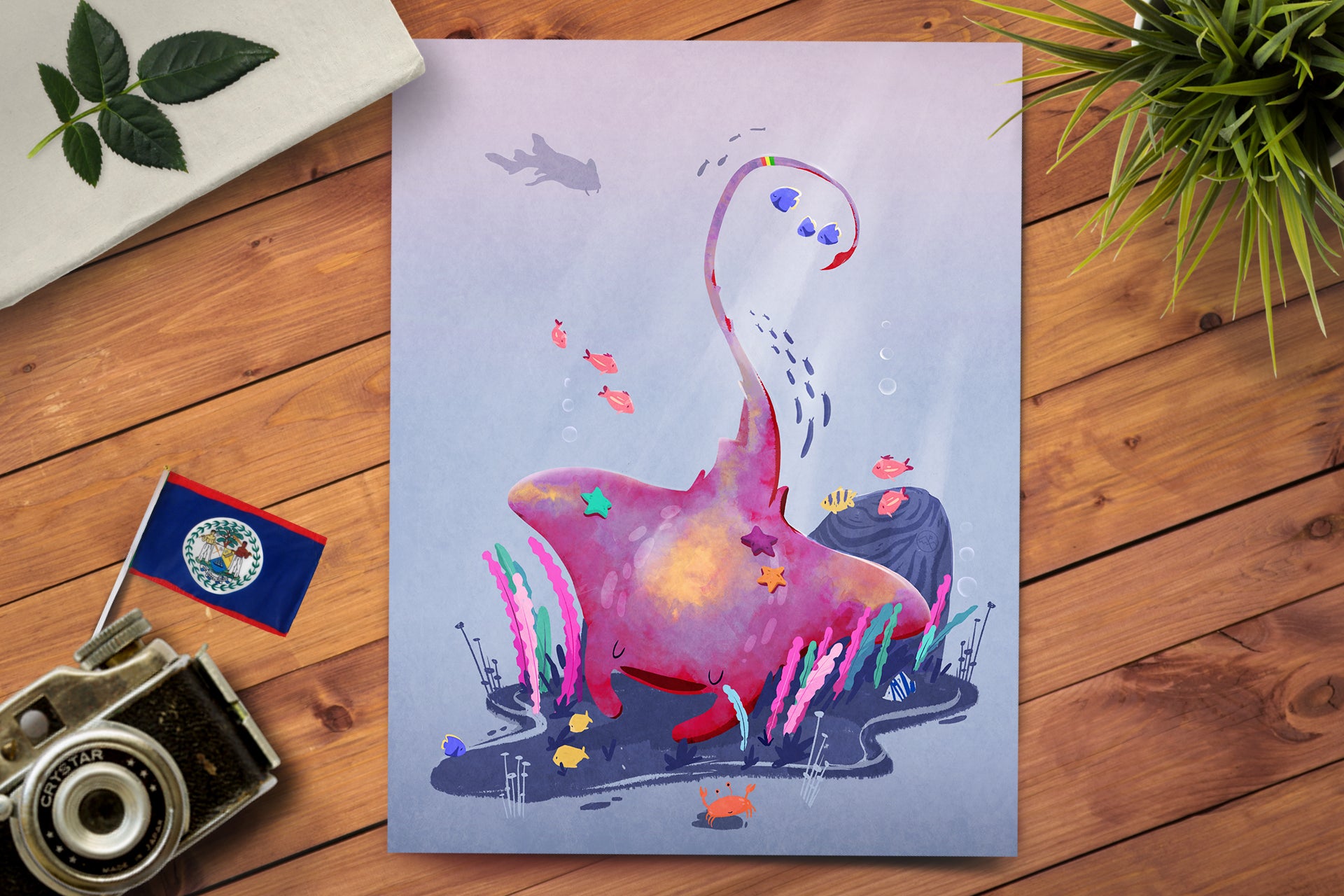 This manta ray art print features a brilliant underwater beast discovered by Alistair and Purna in the sublime waters of Belize in September 2005. Available in multiple sizes, this whimsical art print comes ready for you to frame and hang in your favorite spot.