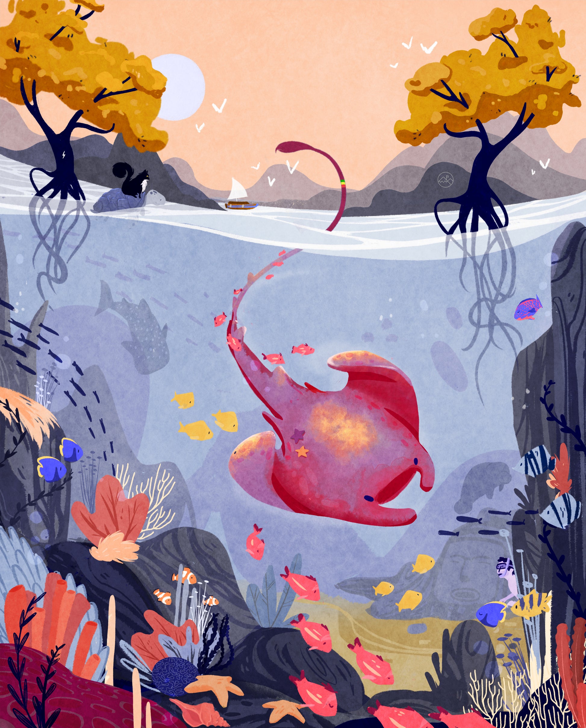 This underwater art print features the sensational seascapes of Belize visited by Alistair and Purna in September 2005. Available in multiple sizes, this whimsical art print comes ready for you to frame and hang in your favorite spot.